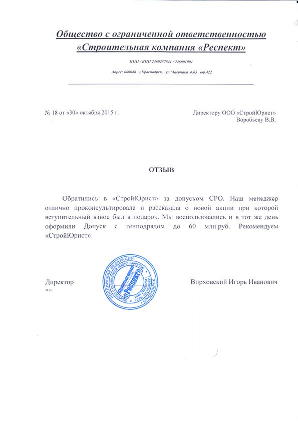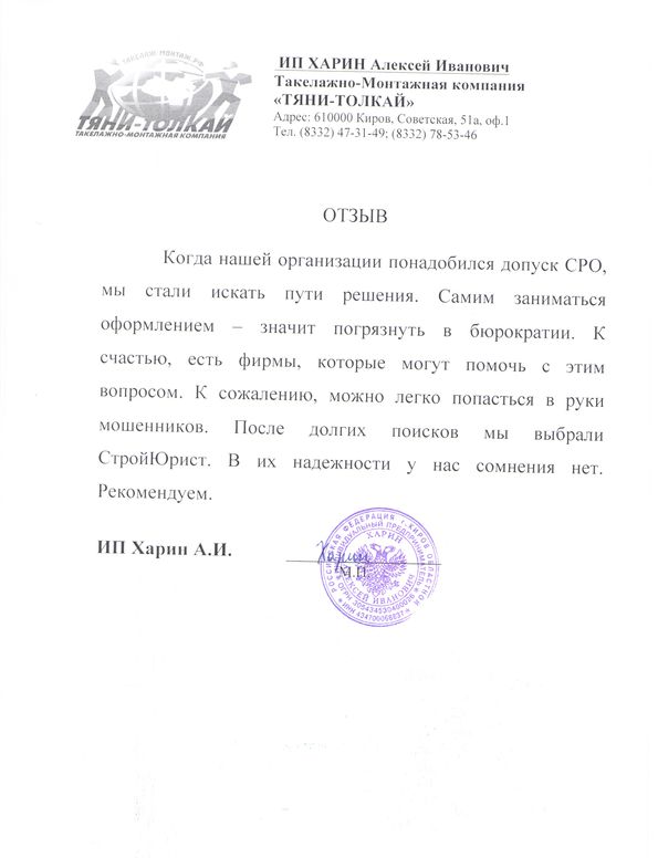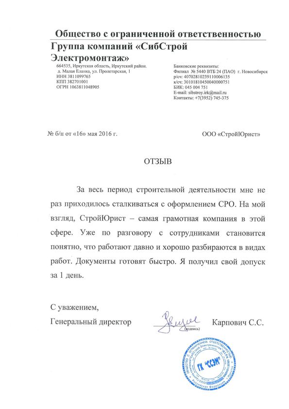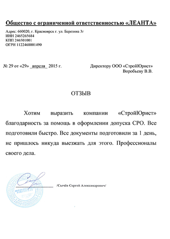 Отзывы клиентов "СтройЮрист" по вступлению в СРО в Сочи